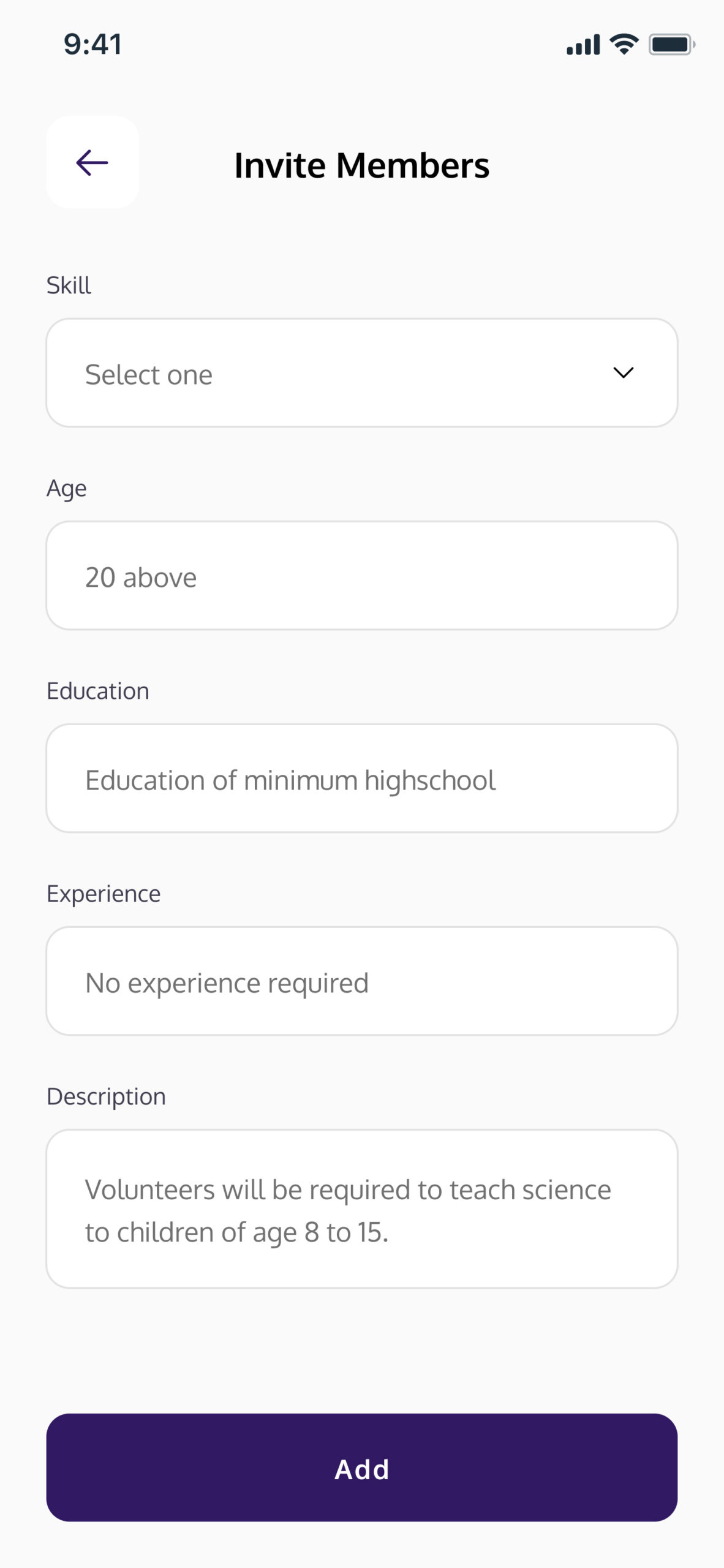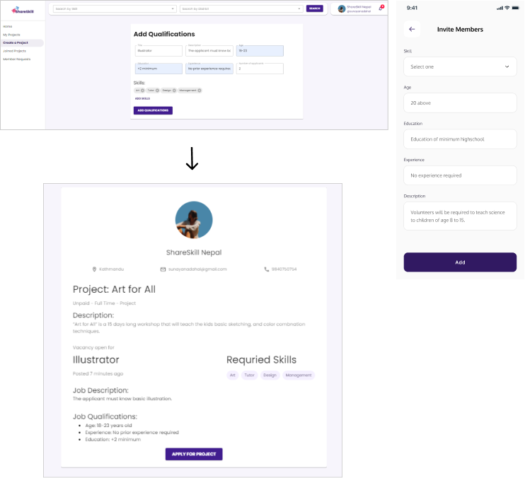 When inviting other users to join the project, the project starter creates vacancies. The vacancies must consist of required qualifications, experience, age, skill tags, etc.