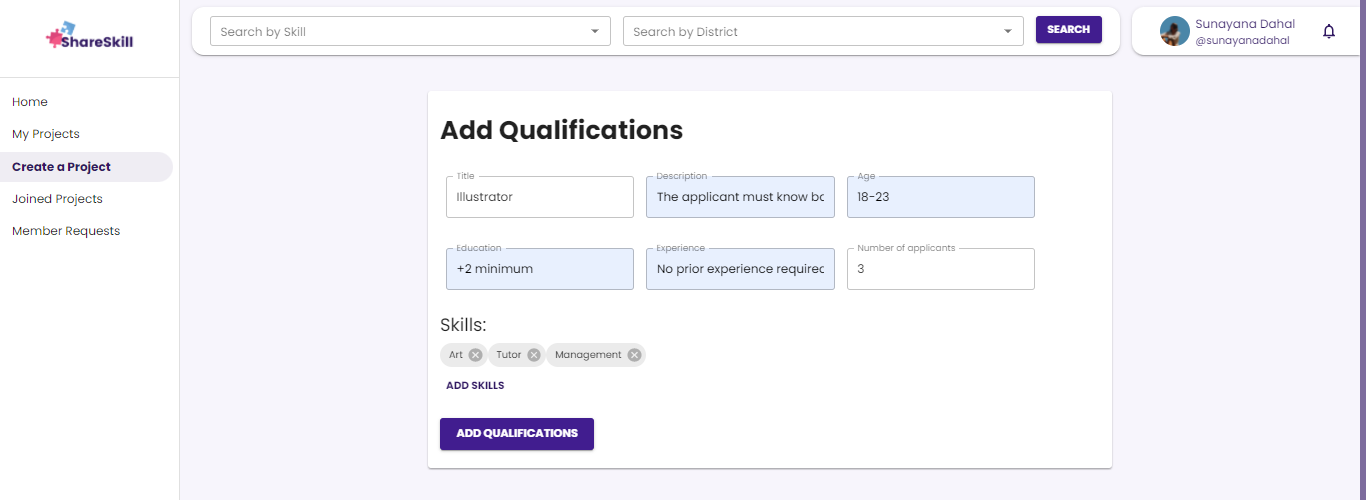 The project starter can post vacancies for the project. They can describe their ideal project teammate by mentioning required skills, age, qualifications, etc.
